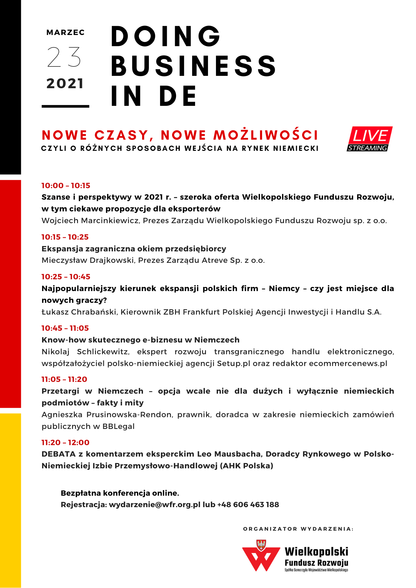 Zapraszamy na konferencję online na temat możliwości biznesowych na rynku niemieckim oraz wsparcia ekspansji zagranicznej dzięki środkom Wielkopolskiego Funduszu Rozwoju sp. z o.o.
